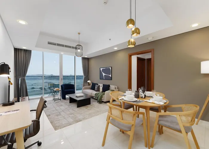 Maison Privee - Modern Business Bay Retreat With Dubai Canal Views appartement heeft uitzicht over grachtzichten en bestaat uit een patio, een balkon en een zitruimte met airconditioning. De accommodatie heeft een bidet, een apart toilet en een douche voor uw comfort. Daarnaast vindt u er een haardroger, een badmuts en handdoeken.